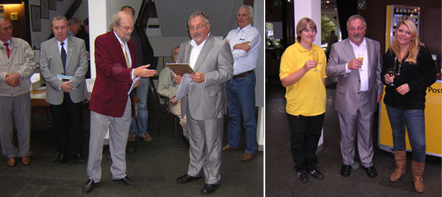 Der Verein selbst wird gleich mit gefeiert, hat er doch sein 20jähriges Jubiläum. Jürgen Hoffmann nimmt die Urkunde des Landesverbands entgegen - und darf sich dann bei den Damen von der Post, die ihn fürsorglich in die Mitte nehmen, erholen. Der Vorstand des Landesverbands beginnt anschließend mit seiner Vorstandssitzung. |