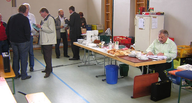 Zum Tauschtag kamen 13 Händler und 96 Besucher. Germeringer Mitglieder waren wieder einmal stark vertreten. Der Einsatz der Briefmarkensammler Vaterstetten und die reichliche Werbung für diese Veranstaltungen haben sich gelohnt. Knapp doppelt so viele Händler und Besucher wie beim Tauschtag letztes Jahr. Die Ausstellung war an beiden Tagen gut besucht, die Händler waren zufrieden und die Post erzielte einen überraschend guten Umsatz. Kaffee, belegte Brötchen, Würstel und Getränke waren gut und preiswert. Gegen 14:00 Uhr lehrte sich langsam die Turnhalle, die letzten Besucher führten letzte Gespräche und Jürgen Hoffmann sitzt wieder bei der Arbeit. Und dann begann das große Aufräumen. |